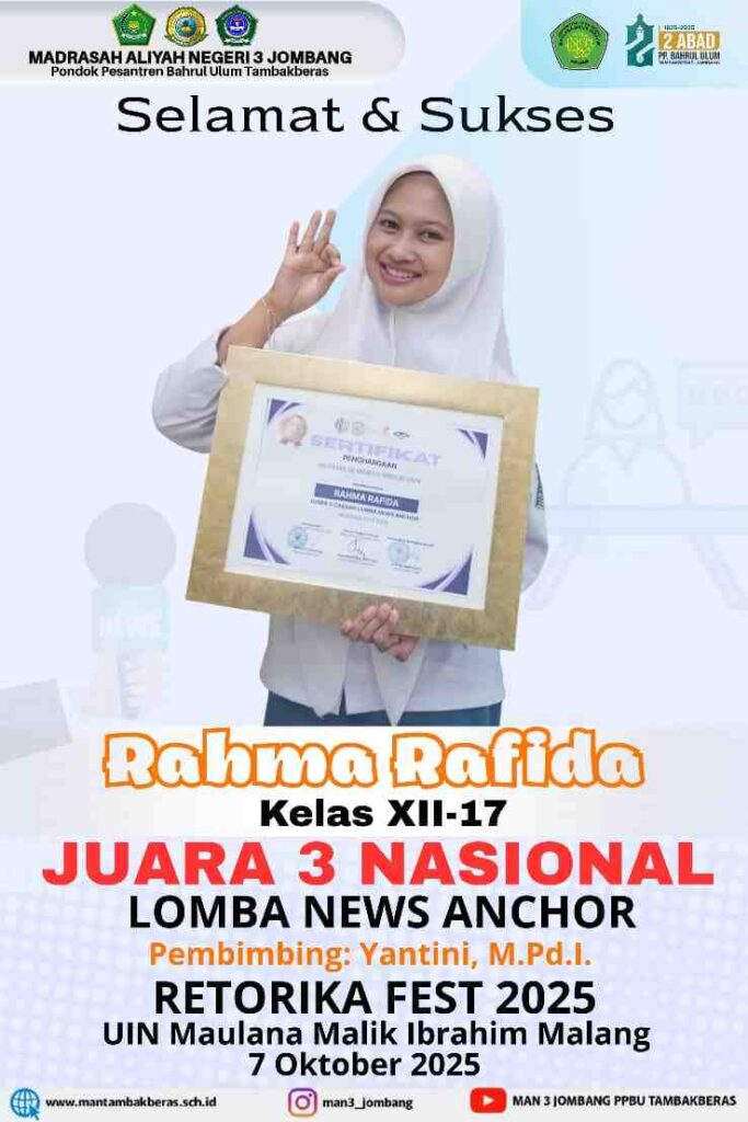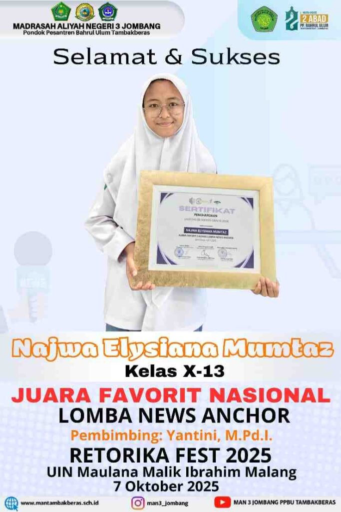 Kabupaten Jombang (MAN 3 Jombang)- dua siswi MAN 3 Jombang berhasil pemukau dewan juri dan Netizen dalam lomba News Anchor alias pembawa berita. Lomba news anchor bertajuk Retorika Fest 2025 diselenggarakan Fakultas Ilmu Komunikasi UIN Maulana Malik Ibrahim (UIN Maliki) Malang. Perlombaan terbuka untuk umum. Teknis perlombaan secara online dengan meng-upload video saat pembawakan berita. Video di upload di media sosial Instagram masing- masing peserta dengan menandai akun penyelenggara. Deadline upload karya pada akhir September lalu. pengumuman hasil lomba melalui akun Instagram resmi Fakultas Ilmu Komunikasi UIN Maliki pada Rabu (08/10/25).