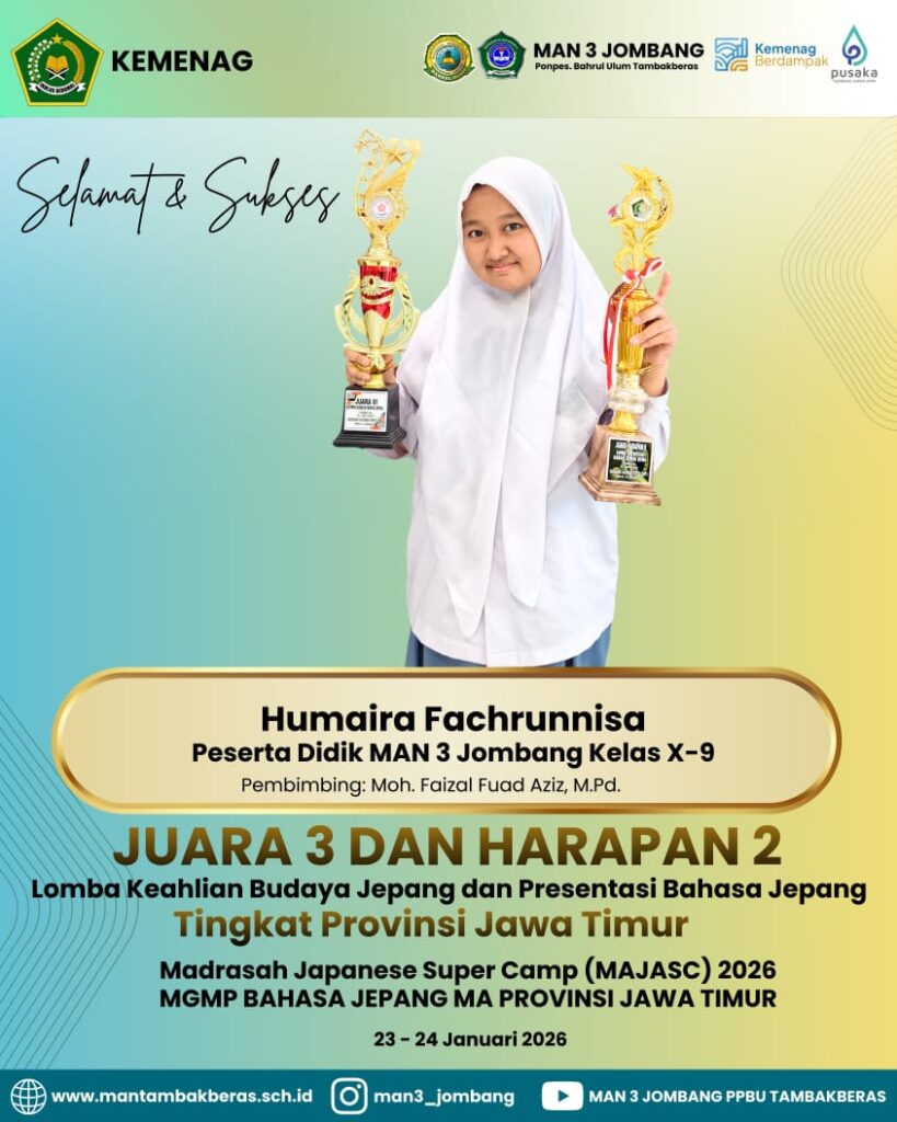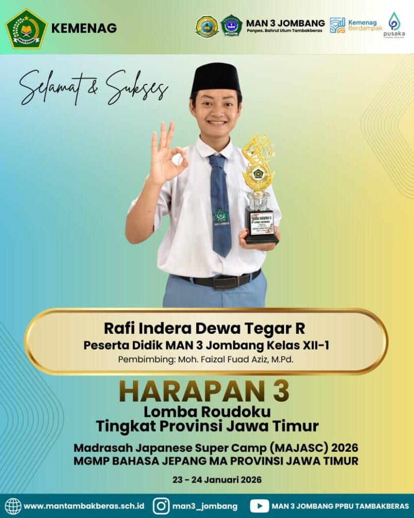 Kabupaten Jombang – MAN 3 Jombang kembali menorehkan prestasi membanggakan dalam ajang MAJASC 2026 (Madrasah Aliyah Japanese Super Camp) yang diselenggarakan oleh MGMP Bahasa Jepang MA Jawa Timur. Kegiatan bergengsi ini berlangsung selama dua hari 23 sampai 24 Januari 2026. Tujuan utamanya sebagai ajang pengembangan keterampilan bahasa Jepang bagi siswa dan guru madrasah.