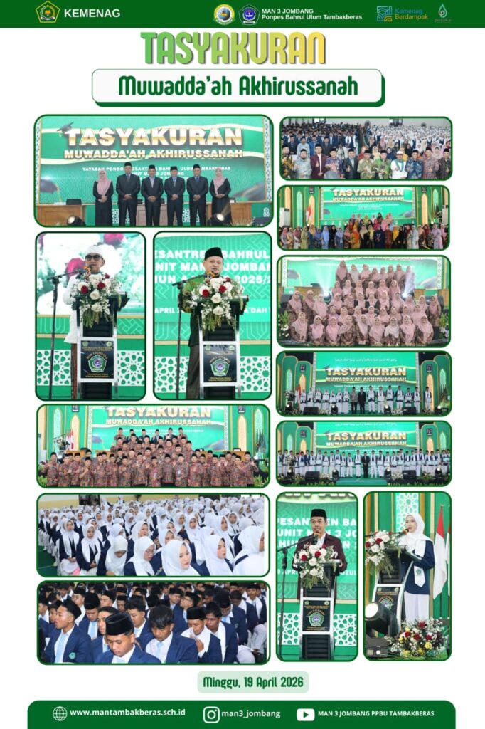 Kabupaten Jombang (MAN 3 Jombang)- MAN 3 Jombang menggelar tasyakuran muwadda’ah akhirussanah bagi siswa kelas akhir. Agenda berlangsung pada Ahad (19/04/26) di Gedung serba guna Hasbulloh Said. Tampak siswa kelas akhir hadir didampingi para wali siswa dibarisan tamu undangan. Agenda diawali dengan prosesi pelepasan siswa kelas akhir oleh jajaran pimpinan yang digawangi kepala madrasah, Sutrisno ME. Sebanyak 781 siswa dinyatakan lulus dari madrasah kaya juara ini.