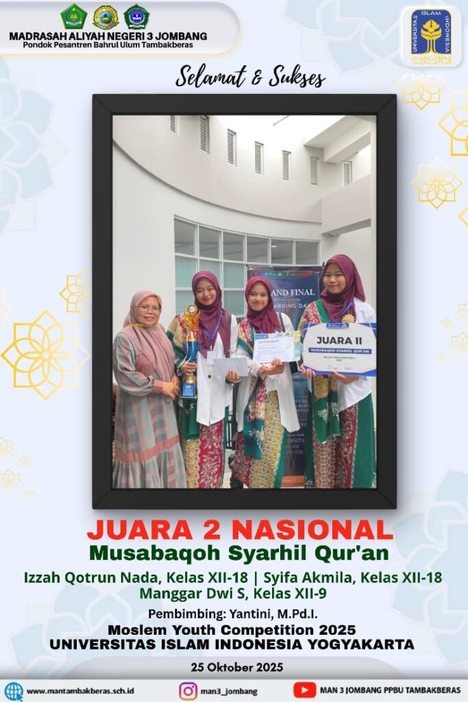 Kabupaten jombang (MAN 3 Jombang)- Tiga siswi MAN 3 Jombang mengikuti ajang Moslem Youth Competition 2025. Kompetisi digelar Universitas Islam Indonesia Yogyakarta. Tema yang diangkat tahun ini“Santri Berkarya Dalam Irama Seni Dan Budaya Menuju Indonesia Berjaya”. Beberapa cabang lomba meliputi Musabaqoh Syarhil Quran (MSQ), Khitobah, Reels, dan hadroh.